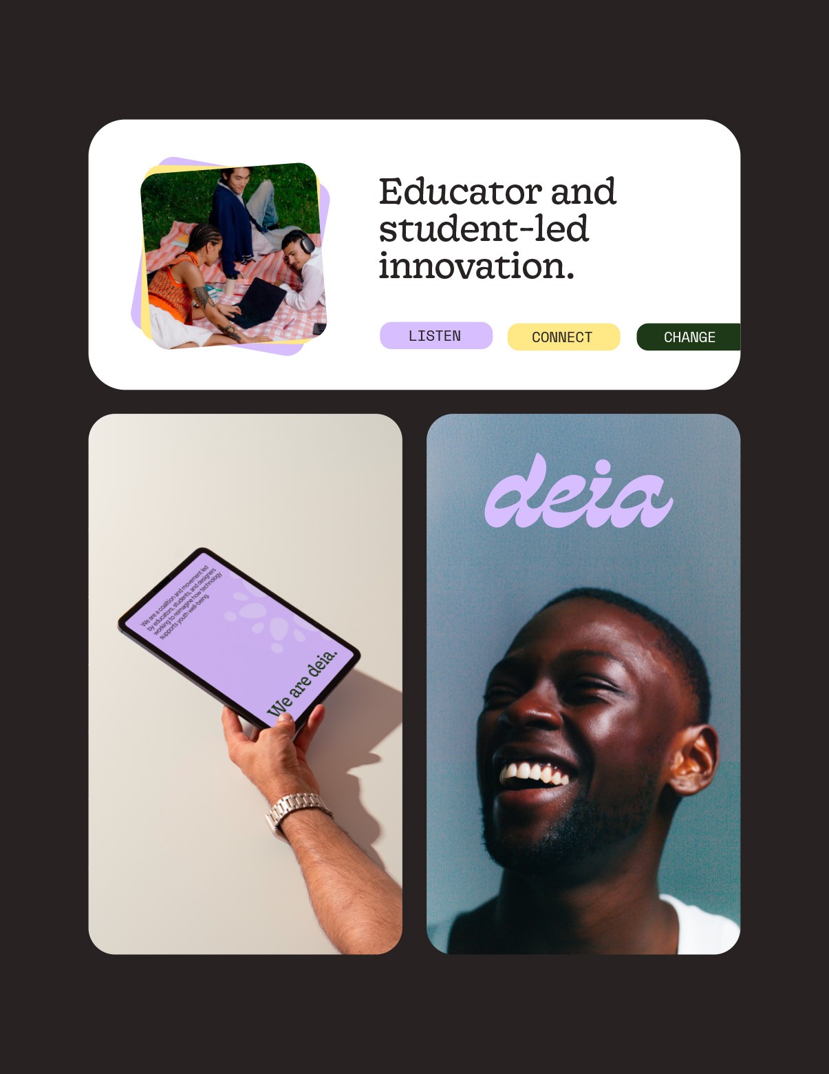 deia is a coalition led by educators, students, researchers, leaders, and designers working to rethink how technology can better support youth well-being. For this project, I developed a visual identity that reflects collaboration, inclusivity, and forward thinking—highlighting deia’s mission to give young people and educators a real voice in shaping the technology used in education.